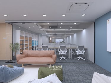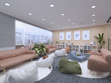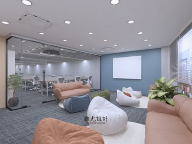 A colorful team office designed to encourage connection and creativity. Vibrant tones and flexible layouts shape a lively workspace, anchored by an informal lounge area with a mix of sofas — a place to sit freely, talk openly, and spark new ideas.